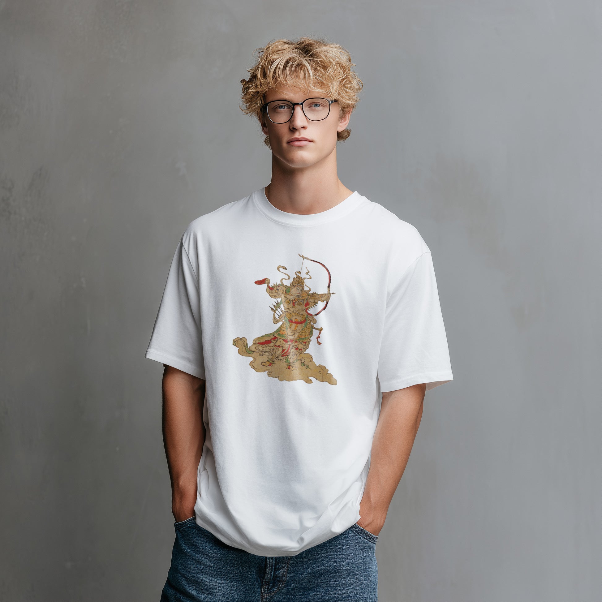 This artwork depicts Bishamon Ten, who exterminates evil spirits that bring harm and illness. A Buddhist guardian of the north, he is also revered in Japan as a god of war. In this scene, Bishamon Ten appears on a cloud and shoots arrows at two demons attempting to interrupt a monk’s training. The demons flee in panic, but one in the rear is struck by an arrow.